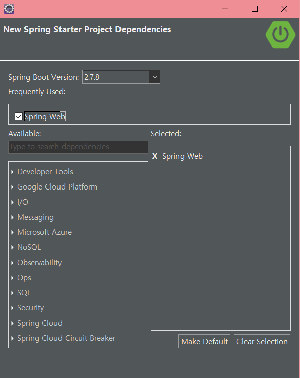 저는 2.7.8 버전과, Spring Web을 선택했습니다.