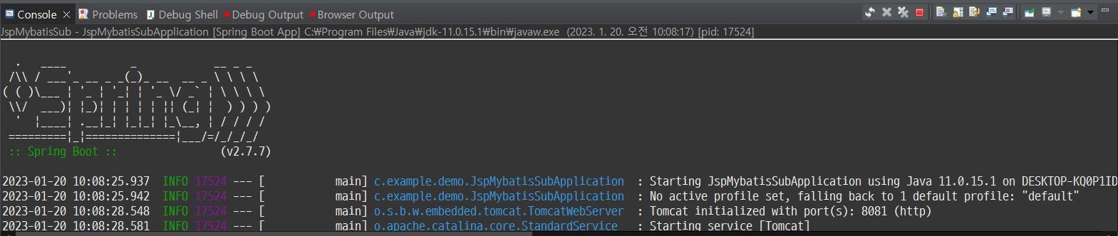 하단 콘솔창에서, Spring 글자가 출력되면서 프로젝트가 실행되는 것을 확인할 수 있습니다.
