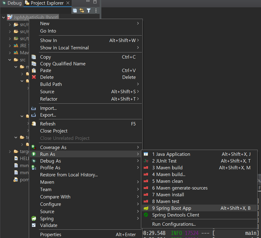 프로젝트에서 우측 마우스 클릭 - Run As - Spring Boot App 을 클릭하여 프로젝트를 실행시켜봅니다!