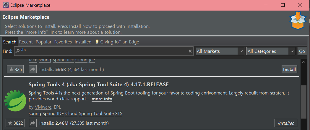 'sts' 를 입력하여 Spring Tools 4 (aka. Spring Tool Suite) 를 다운받습니다.