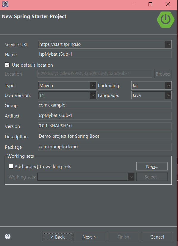 저는 Maven, Java 11버전을 선택했고, 프로젝트 이름을 정해주었습니다.