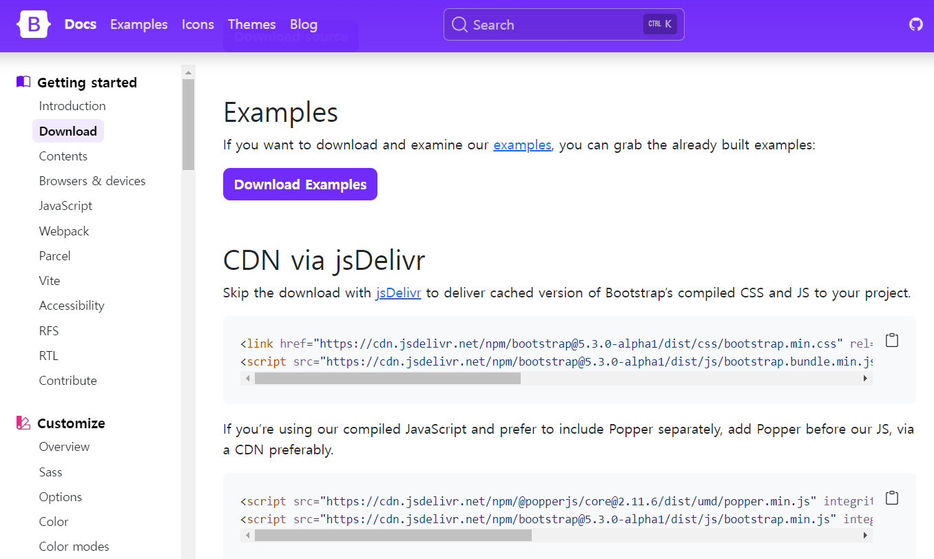Docs > Download > Examples > CDN via jsDelivr 에 작성된 코드를 확인하고,